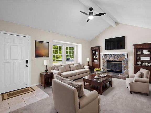 Immaculate and adorable raised ranch on a lovely, quiet lot in charming Pleasant Valley with easy highway access? You've found it! Lovely curb appeal welcomes you, and the bright and airy great room with a cozy fireplace and high ceilings invites you to stay awhile. The adjacent kitchen is updated with lovely dark cabinets including a sizable pantry, tasteful backsplash, and a granite-topped island for extra counter and storage space. French doors open up to the adjacent covered deck and offer beautiful views of the backyard made tranquil by a thick line of trees. Three nicely sized bedrooms, including a primary suite with its own private bath, round out the main level. Downstairs, a partially finished basement hosts a large laundry room and a rec room perfect for adding a home office, gym, or game room. Super convenient access to the extra deep garage with space for a work bench and additional storage. Welcome home!