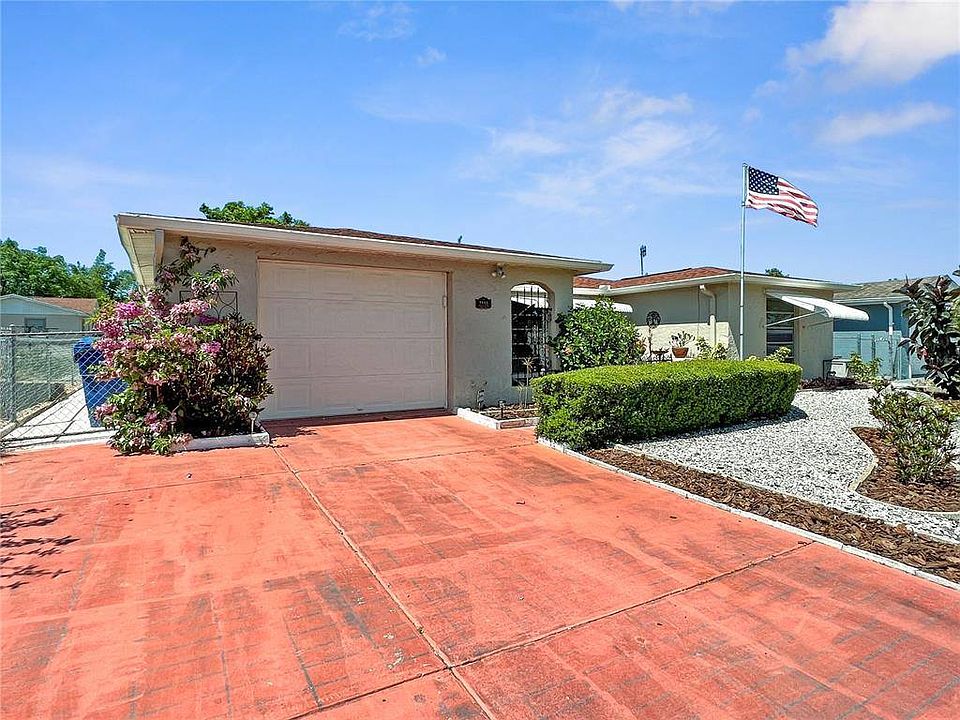 BEAUTIFUL PORT RICHEY POOL HOME. When you approach the front of this 2 bedroom, 2 bathroom home, the front courtyard welcomes you with its cozy seating area; a great place to enjoy your morning coffee or an evening glass of wine. Walking through the front door you will notice the spacious floor plan that flows through to the sliding doors to the covered lanai and pool area. You will enjoy entertaining in your kitchen that is open to the family room and a dining area. The kitchen has new stainless steel appliances, tile backsplash and plenty of countertop prep space. There is ample room your guests to sit at your breakfast bar and as you show off your cooking skills. Waterproof vinyl flooring was installed in the main living areas. The family room has a sliding door to the covered lanai and pool area; an area perfect for entertaining with a pool party or a BBQ. Both bedrooms are large enough for king-sized beds and feature tile flooring. In addition to this tastefully updated home interior, this home has a new roof (2022), HVAC (2021), hot water heater (2022), and garage door (2022). The pool was also resurfaced (2022), and there are new ceiling fans throughout. Call for your showing today.