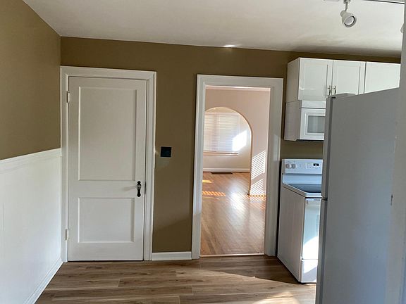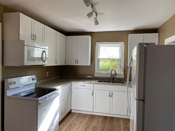 Remodeled in 2021. Two bedrooms on first floor and full bath.Front entry room large with hardwood floors followed by dining room with hardwood floors and remodeled kitchen.Large backroom recently remodeled. Upstairs with 3 bedrooms with half bath, recently remodeled and all hardwood floors upstairs as well. Unfinished large basement with great storage.Garage door access to basement. Large Parking area Security deposit and first months rent due at signing. Utilities not included. Non smoking and no pets.