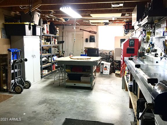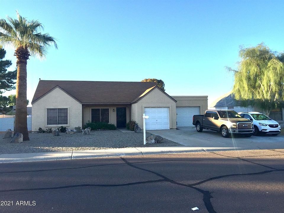 A great 2 bd home with additional den/exercise room/nursery. Nice area, close to schools & parks. Vaulted living rm, dining rm & kitchen. Tile/hardwood floors. Kitchen features updated fridge, microwave, oven plus plenty countertops and cabinets. Dining rm with french doors lead to a covered patio and large grassy yard, perfect for entertaining. Recently remodeled laundry & pantry offers lots of storage. Ideal for projects/ toys is the workshop inside the 2nd garage, 14'x27', 220v power available for welder or other tools. Both garage spaces have split A/C units. This home includes 4 yr old updated 2-stage A/C. All windows with blinds, all exterior doors with screen security doors. Long RV/boat parking on the side of the house with gate. Sq.ft. doesn't include the bedroom plus. MUST SEE!