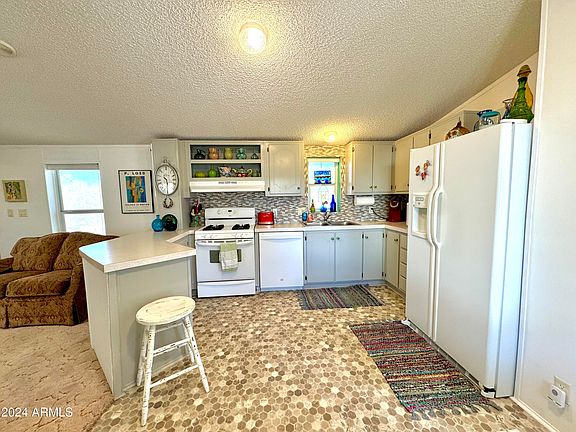 *BRAND NEW SEPTIC! HOME IS FINANCEABLE* Beautifully updated 3 bed, 2 bath home on a spacious 1/4-acre lot! Fully fenced with 3 RV gates and an RV hookup. Prime location right off HWY 60 with alley access. Large detached single-car garage with workshop, sink, vanity, toilet, storage cabinets, & laundry area (washer & dryer included). There's also an additional storage shed with shade. Enjoy the sunrise and sunset from your covered porch with recently resurfaced deck. This property is turn-key with a new roof, new windows, new AC unit, updated interior, & recently painted exterior. Inside you're welcomed by an open-concept living area. The tasteful kitchen showcases painted cabinets with new hardware, new flooring, backsplash, tons of counter space, breakfast bar, gas stove with hood, dishw asher, & sink overlooking the yard. There is even an eat-in kitchen area that also makes a nice office space. The kitchen opens to the great room with vaulted ceilings & door to back porch. Your master suite boasts a walk-in closet & en-suite bathroom with new flooring, painted vanity with backsplash, & tub/shower combo. 2 additional bedrooms on the opposite side of the home. Guest bathroom also has a painted vanity with backsplash, new flooring, & walk-in shower. Inside laundry hookup in the large storage closet that also doubles as a pantry. Mature trees, gravel, & decorative landscaping add to the charm of this beautiful property. This is the perfect place to call home. *Seller Financing available.* Come see today!