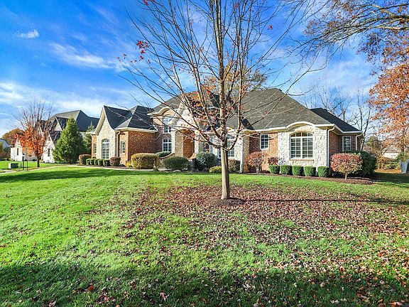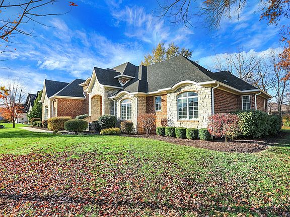 Discover timeless beauty & refinement in highly sought-after, gated Diamond Ridge at the Pointe. This stunning, custom built 5-bedroom, 3 1/2 bath ranch style home invites the outdoors in with expansive windows, showcasing natural light and views. The centrally located great room is a true masterpiece, featuring floor-to-ceiling built-ins and a coffered ceiling, creating a focal point. The heart of this home is it's spectacular eat-in kitchen w/ custom cabinets, SS appliances, granite, a long island & walls of windows that brighten every corner. Spacious walk-in pantry offers effortless storage. Impressive 2-story library/den, complete with built-ins and soaring windows, creates an inspiring space for both work & relaxation. Engineered hardwoods throughout the main level. Venture downstairs to the vast basement, thoughtfully designed with a dedicated theater area for movie nights. A private hallway leads to 2 well-sized bedrooms sharing a large bathroom, making it an ideal private guest suite. Outdoor, relax on the generous covered patio or step down to the stone patio with a cozy fireplace, perfect for gathering or unwinding. Storage abounds throughout the home, ensuring that everything has a place. This home is truly a haven of comfort, elegance and practicality.