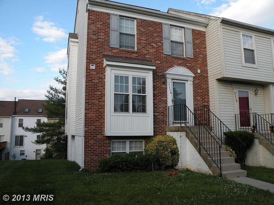 Spacious brick front, three level end unit townhouse. Siding and roof replaced four years ago. Gleaming hardwood flooring in foyer and dining room. Sunken living room with sliding glass door. Two master bedrooms each with full baths on upper level. Basement with guest bedroom, full bath, rec room and walk out level. Lots of closet space. Sold as is.
