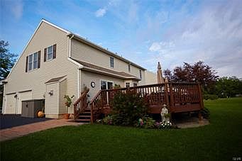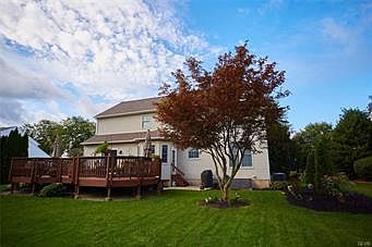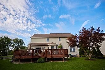 This attractive East Penn home boasts four bedrooms, two full and one half bathrooms, spacious main floor, finished basement, and deck overlooking the backyard. Eat-in kitchen with center island, desk space, recessed lighting, and pantry with ample storage. Formal living and dining rooms with neutral carpet, large windows, and beautiful crown molding. Large family room with gas fireplace, eyeball lights, ceiling fan, and sliding door to deck and backyard. Spacious master suite with bonus area (perfect for home office, exercise space, or reading nook), two walk-in closets, and full bathroom with split vanities, soaking tub, glass door shower, and linen closet. Three additional bedrooms and full bathroom with tile floor, double vanity, and bathtub/shower complete second floor. Finished basement with Bilco door offers an additional floor of living space and plenty of unfinished storage space. Enjoy the scenic view of Bear Creek and the large playground with open space nearby.