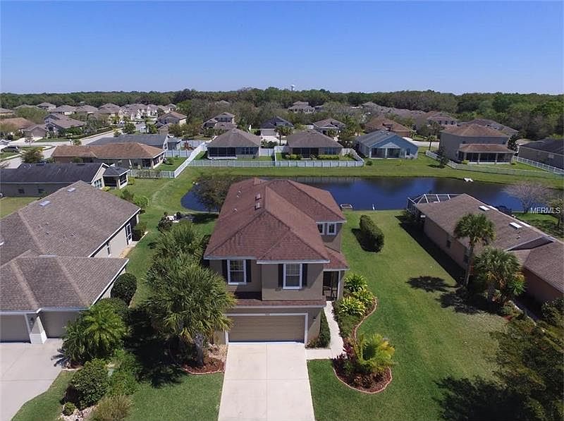 This stunning two story home in Crystal Lakes is perfect for the ever growing family. It boasts 4 bedrooms plus den, 2 1/2 baths and 2,266 square feet of living space. Built 2010. A large salt water Pebbletech pool with brick pavers and a beautiful water view behind your home for your enjoyment. The pool is less than 1 year old. The kitchen has darker wood cabinets, and Corian counter-tops and breakfast bar which is perfect for preparing meals and entertaining guests. Wood floors in the living room and dining room. Open floor plan. A den is situated off the master bedroom. The master bath has a walk in shower, a separate luxurious garden tub, and dual vanities. All windows in the home are double pane. Hurricane shutters included. Exterior of home recently painted. Extra space between you and your neighbor. Community has playground and basketball court. This home is ideal for anyone making a commute to Tampa, St Pete, or Sarasota. I-75 and I-275 are only minutes away. Close to restaurants, shopping, outlet mall and white sandy beaches. Low HOA fees (only $540 per year) and No CDD fees.