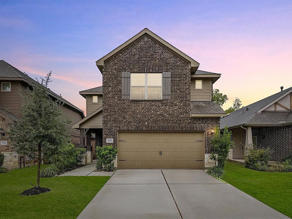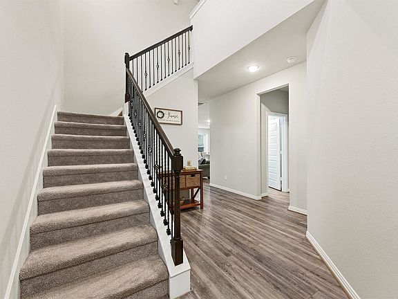 Beautiful two-story home offers charming curb appeal with brick exterior and inviting front porch. Step inside to an open living space where the living room seamlessly flows into the kitchen and breakfast nook. The kitchen features sleek stainless steel appliances and plenty of counter and cabinet space. The oversized laundry room provides additional convenience and functionality. A secondary bedroom is located downstairs with its own ensuite bathroom, offers flexibility for guests. The primary bedroom features a private ensuite with a relaxing soaking tub, a separate glass-enclosed shower and a generous walk-in closet. Additional upstairs bedrooms include cozy plush carpeting, ceiling fans for comfort and oversized walk-in closets. Enjoy the well-maintained, private backyard complete with a covered patio—ideal for outdoor dining, relaxing, or hosting gatherings. This home is the perfect blend of comfort, style, and functionality.