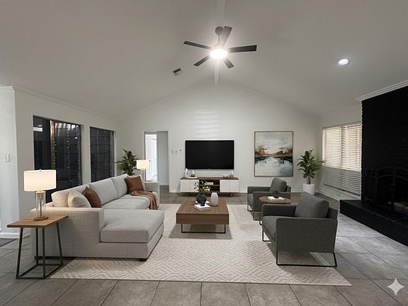Step inside to an open floor plan with soaring ceilings and abundant natural light. The spacious living room includes a cozy fireplace, while the renovated kitchen features a large island, stainless steel appliances, and modern finishes. Both bathrooms have been beautifully updated, giving the home a fresh, contemporary feel.