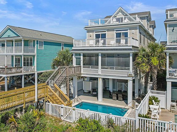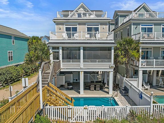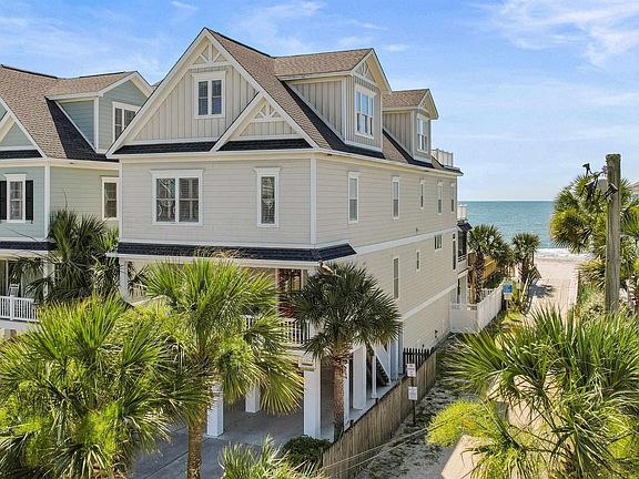 Welcome to ‘Washed Ashore’ perched oceanfront on the desirable Surfside Beach. Enjoy endless views of the Atlantic Ocean from this 7-bedroom, 7.5-bathroom custom-built home. Superior quality finishes and features are appointed throughout the home, including but not limited to 9-feet ceiling height on every level, wainscotting, solid core doors, Australian Cypress hardwood floors on first floor, wide plank White Oak floors on upper levels, granite vanities, plantation shutters, Emtek door hardware, gas fireplace, wet bar with wine cooler and ice maker, dual laundry closets with full-size washers and dryers. There is a gourmet kitchen equipped with a gas cooktop, double ovens (one gas, one electric), GE Monogram stainless steel appliances, butcherblock top work island, Zimbabwe brushed black granite countertops, and a large breakfast bar. Every bedroom of the home has a private bathroom and three located on the 2nd and 3rd floors are oceanfront with access to balconies that have expansive beach and ocean views. An elevator from ground floor to two upper levels makes for easy access, additionally, the first-floor ensuite bedroom offers a zero-entry handicap-accessible shower. The interior has been lavishly decorated with coastal-themed fine art, colors, and furnishings – all of which will convey with the sale. Bedding arrangements to comfortably accommodate 18 guests. All of the preferred exterior amenities of a beachfront property are also featured inclusive of a screened oceanfront porch, private heated outdoor pool with stone paver decking, private direct beach access walkway, enclosed outdoor shower, and attached golf cart storage room. This property is enrolled in a vacation rental program with a successful history of repeat renters that produces strong annual rental income. To view this unique property, call today to schedule a private showing.