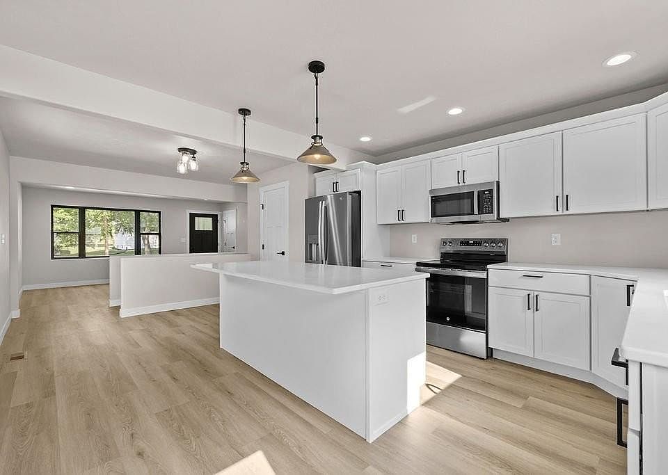 Next to New! Check out this completely remodeled home with everything from brand new shingles, siding and windows to the entire interior being gutted and remodeled beautifully with all new finishings. This is not your average remodel! Additionally, the property includes a newly built 3-stall heated garage! This 4-bedroom, 3-bath home features an open concept living room and a large kitchen with white finishings. The kitchen features a center island that is ideal for so many things. Modern stainless-steel appliances, quartz countertops and a spacious pantry. Two of the bedrooms are situated on the main floor, including the perfect primary bedroom which boasts a ¾ bath with a tiled shower and walk-in closet that also accommodates the laundry area. A full bath is located in the hallway. Down the stairway, there are 2 additional bedrooms, a ¾ bath, and a family room area with a wet bar. The outdoor area includes a very nice concrete patio for grilling and entertaining. The house has all new plumbing, electrical and HVAC/duct work. Don’t let this one pass you by!