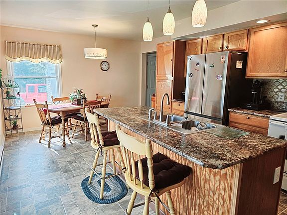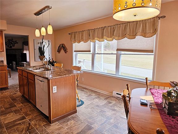 This well-maintained ranch house is located on a corner lot. As you step inside, you're greeted by a spacious layout featuring three bedrooms and two bathrooms, providing ample space. The master bedroom is a true retreat complete with a large garden tub perfect for unwinding after a long day along with a stand up shower. The heart of this home is undoubtedly the huge kitchen, complete with an island that invites gatherings and offers tons of storage. Adjacent to the kitchen, the mud room offers practical storage solutions and easy access to the outdoors. The living area is made cozy with a wood-burning stone fireplace, creating the perfect ambiance for chilly evenings. Natural light floods in through the windows, highlighting the open-concept design and making the home feel even more welcoming. Outside, the back deck provides an ideal setting for outdoor entertainment or simply enjoying your surroundings. A shed adds convenient storage for gardening tools or outdoor equipment.