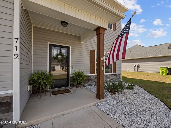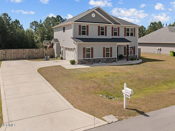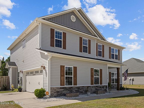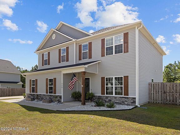 Stop the car! You are going to absolutely LOVE this STUNNER! Located in the highly desirable Village at Folkstone on a large private lot, this 4 bedroom home is loaded with upgrades. From shiplap and moulding throughout, LVP flooring, upgraded knobs, mirror, lights fixtures and more, this home has so many pinterest-worthy details. Downstairs features a home office with double doors for privacy and a formal dining room for dinners and special gatherings. The spacious living room is open and airy with great natural light. The kitchen is sure to please and includes plenty of cabinet space, a pantry, upgraded backsplash, and stainless steel appliances. Upstairs features a loft space which can be used as a second living room, a playroom, or even a work space, as well as three spare bedrooms, each equipped with large closets. The primary bedroom features a trey ceiling with more than enough space for a king size bed, an ensuite bathroom with a tub and walk in shower, and a HUGE walk in closet! You will love spending time outdoors at this home. Enjoy sitting out under your covered porch, grill out on your deck, and enjoy the privacy that is offered with NO visible homes behind you, only trees! This lot is over a half acre; plenty of space for playing and entertaining and can include the play equipment if desired! This home is situated in a great location close to the military bases, the award winning Topsail Beach, and right in between Jacksonville and Wilmington. The washer & dryer also convey with the home! Schedule your showing today!