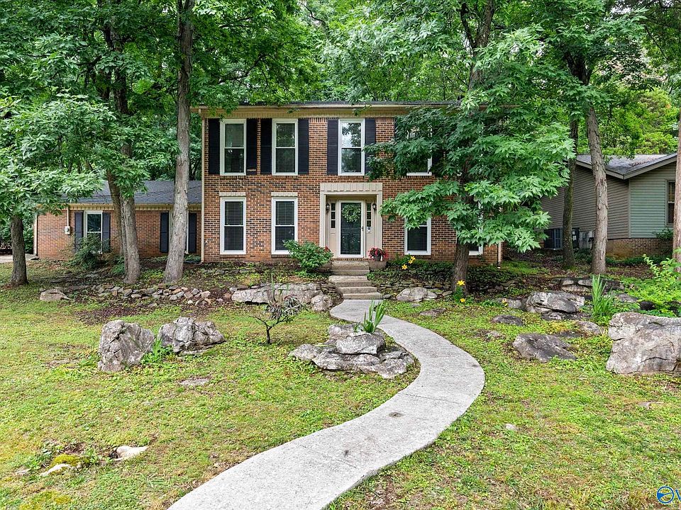 Full brick 2 story home w/ 4 spacious bedrooms & 2.5 baths on an established street in SE Huntsville. This home is in a great location near schools, shopping, Memorial Pkwy & Arsenal, plus nestled on a large, treed lot! If you enjoy entertaining, you'll adore the formal dining, formal living, & great room w/ built-ins & cozy fireplace, leading out to the private, low maintenance, park-like backyard w/ a cobblestone patio, fire pit & pergola. The kitchen is updated w/ granite counters, tile backsplash, white cabinets & equipped w/ double ovens. Hardwoods throughout main living areas & bedrooms w/ smooth ceilings throughout. Come see this beauty for yourself!