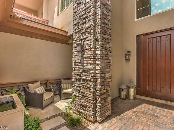 Rare opportunity on the golf course in Canyon Fairways, with stunning views. Over $400,000 in renovations in '19, including completely new kitchen with SubZero, Wolf and Miele appliances and everything you’ll need to entertain! Integrated ice maker, warming drawer, two dishwashers, huge island and separate wine area and beverage fridge. Oversized family room has 12-ft sliders that open up to massive 750 square foot covered patio with built-in smoker and Lynx grill, integrated patio heaters, unique water feature and fireplace/TV. Six-hole putting green and additional lawn area with room for trampoline or play set. Primary bedroom suite includes a room that can be used as an office or gym, with incredible views of the mountains and the sixth fairway and green at TPC Las Vegas. Three additional bedrooms up (two are en-suite) along with a large bonus room. Fifth bedroom downstairs is perfect for a guest room or office. Private courtyard includes a water feature and tranquil sitting area.