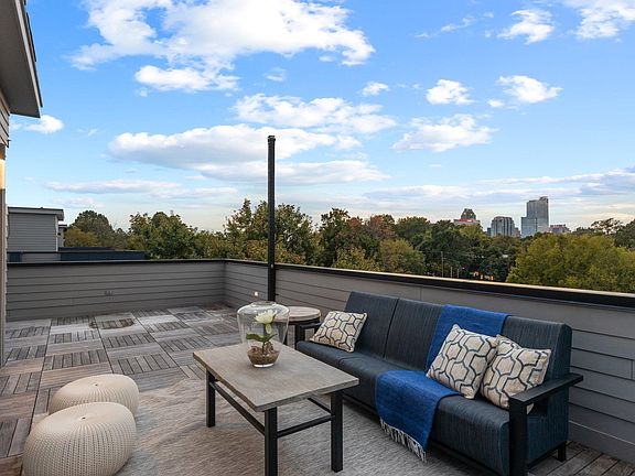 Incredible 3 Bd, 3.5ba end-unit condo with amazing rooftop deck/garden. Stunning skyline views of DTR & North Hills! Garage parking plus two spaces behind unit. Level II 240V EV, Beautiful flooring and tile work throughout home. Walkable location: DTR, Moore Square, Fayetteville St, Oakwood & More. Perfect location for walking to festivals, restaurants & more. Wonderful natural light with floor to ceiling windows, walk in closets, great amount of storage, office desk space can be used for working or entertaining. This unit has it all and is move in ready! It's stunning!