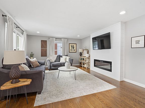 Three generously sized bedroomsCozy eat-in dining areaAbundance of cabinetryLarge front windowCharming character archStunning electric fireplaceBeautiful oak hardwood floors