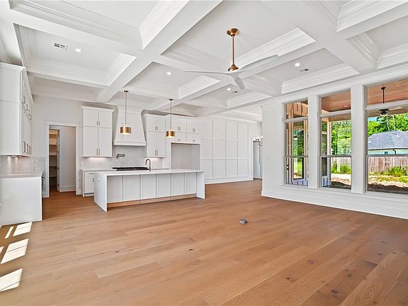 Gorgeous new construction 5 bedroom 3 bathroom home, 90x150 homesite. Coffered ceilings throughout living room and kitchen Quartz countertops throughout. 48 inch range, real wood floors, beautiful marble tile shower in the primary 48x24 inch tiles from floor to ceiling, herringbone tile showers in secondary bathrooms from floor to ceiling. Outdoor kitchen with stained Hardie beaded board. Accent wall in the dining room. Built in desk in the office, full sink and cabinets in the laundry room. 2 ac systems with all hard ductwork. Paint color is white dove.