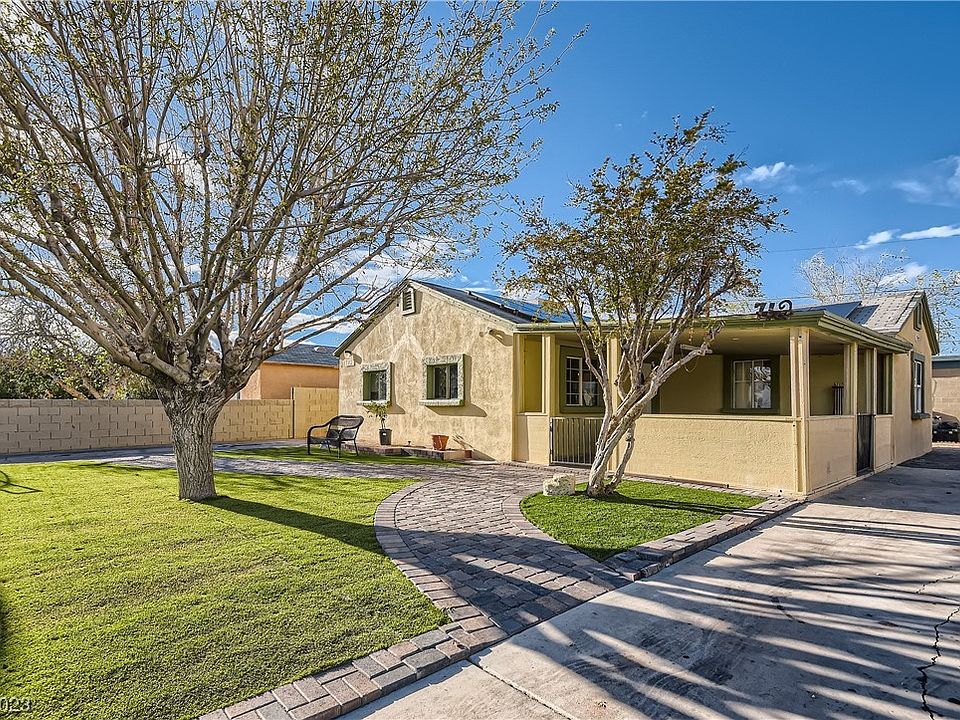 Newly renovated and well maintained home located in North Las Vegas. The fully gated front of home features not one but TWO RV parking spots! Newly installed front yard pavers and artificial turf creates a beautiful curb appeal that seamlessly guides you right to your front door. Fresh exterior and interior paint, new flooring and tile throughout. Kitchen features a double oven, five-burner gas stove top, double sink with upgraded, retractable faucet, built-in microwave, and granite countertops. ALL appliances stay, including front-loading, digital washer and dryer. This home has solar installed to help keep your monthly power payments to a minimum. The oversized front yard and backyard with lush grass and mature trees, has plenty of room to entertain as well as children/pets to play. As a bonus, this property features a permitted, oversized garage that can be used for various options. Easy access to I-15, shops, restaurants, schools and park.