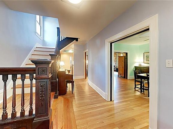 Such wonderful space! Covered front porch with awning. Classic entry with turned staircase and gleaming hardwood. Formal dining room with decorative fireplace opens to spacious living room. Renovated kitchen boasts large peninsula with stainless steel counter top and seating for 5. Main level bedroom with adjacent full bath. Den offers access to rear deck. Master bedroom includes a decorative fireplace and large walk-in closet. Two additional 2nd floor bedrooms - one offers access to private covered porch. Updated hall bath. 3rd floor offers a 5th bedroom and a family room. A gorgeous magnolia tree provides shade to the composite deck. Partially fenced rear yard. Double lot is .7 acre. Concrete driveway and two car garage. Roof is <6 years old with 45 year shingles. Outstanding location offers convenient access to I-279 at multiple exits making all the offerings of downtown Pittsburgh just a short drive away.