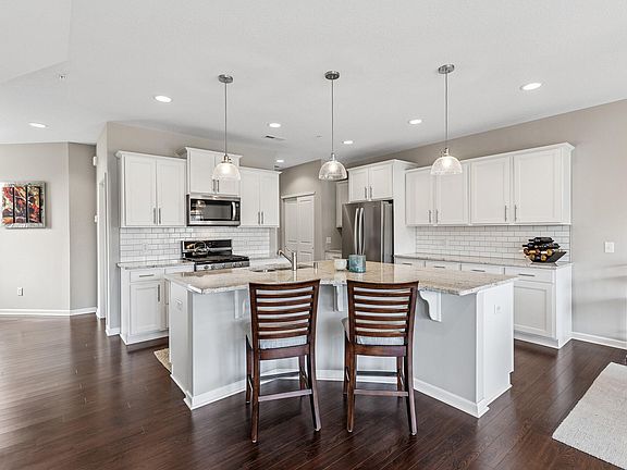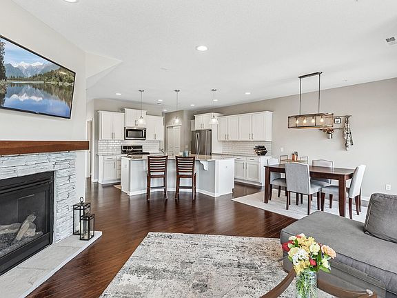 Welcome to this nearly-new two-story end-unit townhome situated on a quiet dead-end street near Lake Susan with easy access to the highway. This home features 3 bedrooms upstairs, including a primary suite with two walk-in closets and a private 3/4 ensuite, complete with a frameless glass shower door and stunning tile work. The upper level also includes two additional bedrooms, a full hall bath and laundry room with utility sink. On the main floor, you'll find soaring 9-foot ceilings and durable solid surface flooring throughout. The open concept design of the main level seamlessly connects the kitchen, dining and living areas with a convenient 1/2 bath located off the front entry hall. The kitchen is equipped with elegant birch white cabinetry with crown molding, granite countertops, a large center island with bar seating, stainless steel appliances and ample storage, including a pantry. The dining area opens up to a patio and green space, expanding your entertaining space during the warmer months. The spacious living room has a gas fireplace with rustic ledgestone surround, an Ozark floating mantel, and plenty of room to relax or entertain. The neighborhood HOA handles your lawn care and snow removal and provides multiple guest parking spots conveniently located near the home. This home is clean and truly move-in ready!