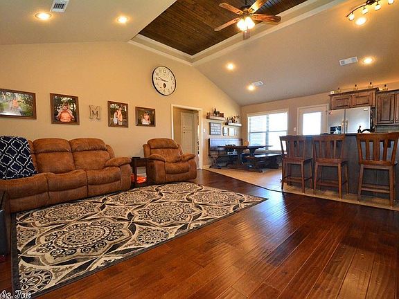 Like new condition and great location Wide open floorplan with soaring vaulted ceiling and wood accent at the top. Hand scarped wood flooring. Nice kitchen layout with granite and a breakfast bar. Big area for dining table. Matching side by side fridge, TV's in living room and master bedroom, Vivent security system plus multi camera surveillance system with 1TB recorder all stay. Master has tray ceiling. Master bath with jetted tube, big shower, twin sinks, lots of built ins! Wide driveway, big garage.