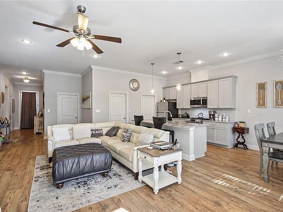 Beautiful garden home, 3 yrs old with 3 bedrooms, 2 full baths, 2-car garage and fenced yard with patio. Open floor plan with high ceilings, wood floors throughout, tile in baths. Kitchen has large pantry, stone counter tops, stainless appliances and light cabinets. Preferred flood zone C. Fenced yard features patio area with natural gas hook up for a grill. Comes furnished with LR, Dining, 3 Br of furniture. (Wall art and decor not included). Refrigerator, washer & Dryer included.