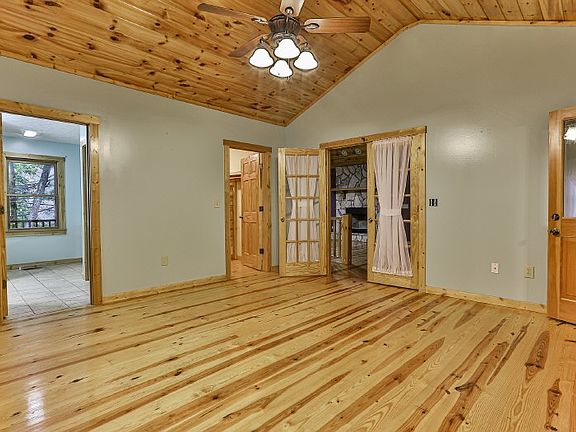 FRONTAGE ON A SERIES OF WATER FALLS ON FLAT CREEK ! This home is light, bright and airy with chalet style glass at two ends of the greatroom. Split bedroom plan. The master has a lovely sunroom/office attached, large walk in closet, spacious bath. Plenty of space for large dining table in the greatroom. Laundry room with room for kitchen pantry. Nice greatroom with rocked fireplace. Cathedral ceiling. Front open deck and extra-wide porch all across the back facing down the hill to the creek. Purchase includes 3 lots that can be platted together to reduce the dues to $1058 per year total. A small price to pay to get a nice cabin and creek frontage of this quality.