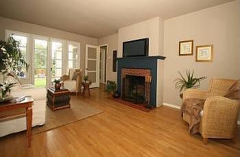 Living room with fireplace, hardwood floors, central air and forced heating, utility room, 2 car detached garage