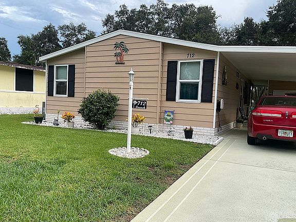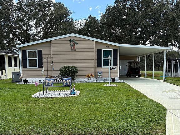 Golf and pond front property with unobstructed views of the pond, its waterfowl, and an occasional golfer in the distance. There is almost complete privacy in your rear yard. This two bedroom two bath manufactured home has been lovingly maintained and is meticulously clean. Decorated in soft neutrals with coordinating accessories. The master bedroom has a large walk-in closet and en-suite bath with a glass enclosed shower. The guest bedroom also has a large closet and hall bath has a tub/shower combination. The kitchen is bright and airy and has custom countertops that compliment the white cabinets and continues with the coastal theme. The adjoining dining area seats four. Off of the kitchen and living room is a generously sized multi-season room-close enough to take your morning or evening beverage outside to enjoy the peaceful views and quietness. The living room is comfortable and inviting with outstanding views also. There is an additional outside covered area with room for your grill. The utility room/golf cart garage has your washer and dryer and a lift up door for easy golf cart access. New double pane insulated windows are thru out the majority of the home. Also included with your home will be the Yamaha 2012 golf cart. It has recently had its annual tune-up, August 2025, and has new batteries. The A/C was installed October 2024 and the hot water heater January 2021. This home is competitively priced for the area. The rear yard is one of only a few with this much privacy and view. Our beautiful Spanish moss covered trees make this a picture book setting. Bring your personal items and enjoy all the Villages has to offer. THIS HOME IS COMPLETELY TURN KEY.