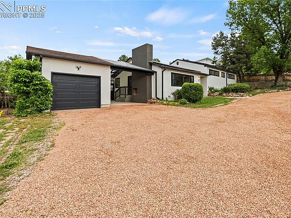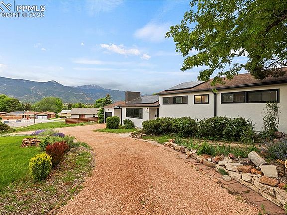 Beautifully updated mid-century home with incredible Front Range and red rock views! This 3-bed, 2.5-bath home includes a dedicated office, modern finishes, and a private backyard with mature apple trees. The bright living room features a bold black brick accent wall and cozy wood-burning fireplace, flowing into a stylish kitchen with wood cabinetry, granite countertops, stainless appliances, and a guest powder room nearby. The primary bedroom includes an en suite bathroom, while the second full bath has been beautifully updated with elegant tile and fixtures. Enjoy breathtaking mountain and red rock views from multiple rooms and the backyard. The fully landscaped lot offers raised garden beds, stone paths, and a covered patio for year-round outdoor living. A rare covered carport connects the oversized 1-car garage directly to the home, and the oversized driveway provides ample parking for guests, trailers, or extra vehicles. Additional highlights: updated lighting, fresh paint, no HOA, and a quiet, established neighborhood near Garden of the Gods, Red Rock Canyon, hiking trails, and downtown.