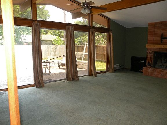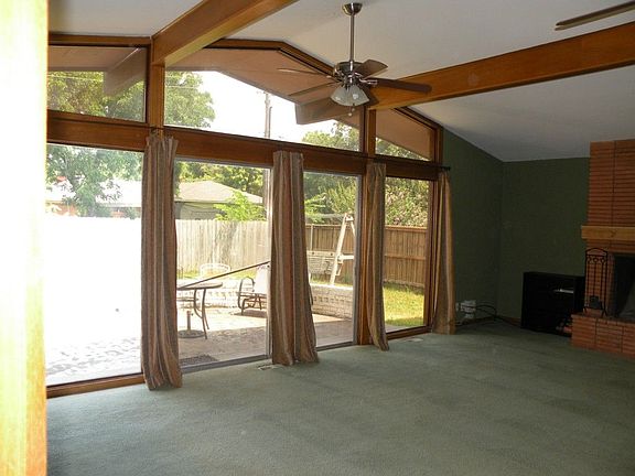 Very nice home in convenient Garland location. Huge open and bright Living area with vaulted ceiling and windows across most of one wall to view the backyard, a section of this room can be used as another eating area with hanging light fixture if you choose and a beautiful brick wood burning fireplace.Both baths have been remodeled and Master bath has over sized walk-in shower. Large backyard with patio and a storage building.