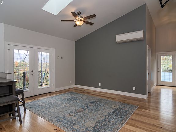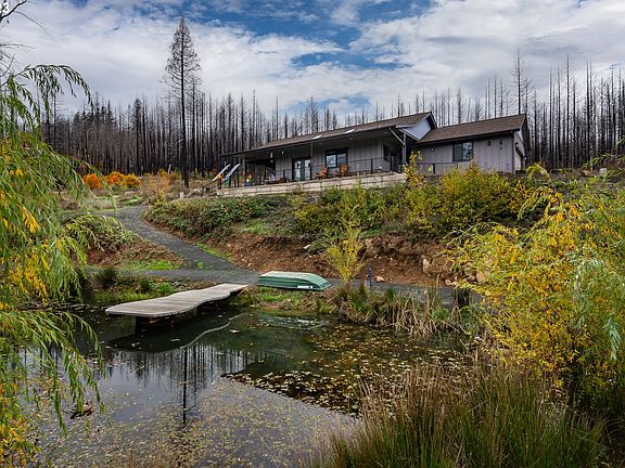 Architecture and artistry meet privacy and serenity in this stellar home nestled in the hills of idelyld park. This 2 bedroom, 2 bath home, built in 2021, has all the clean modern lines of a carefully planned custom build, paired with thoughful artistic touches throughout the home and property. Including the stamped concrete drive, wrought iron railing design, local artist mural in the primary suite and in the guest bedroom. Upon entering the home, you are greeted with natural light from the glass doors, the perfectly placed vinyl windows and the abundance of skylights throughout the home. The great room design and vaulted ceilings provide desirable, open and easy living. The vinyl plank flooring is both tasteful and durable. The stunning kitchen provides all of today's amenities with generous storage, white cabinetrty, sleek granite countertops, a colorful tile backsplash, stainless steel appliances, and a convection oven. The primary suite hosts double closets, vaulted ceilings, a skylight and a spacious bathroom with generous lighting. The main bathroom opens to both the hallway and the guest bedroom. From the bathroom, take a few steps out to the sun-porch; a fully screened in porch complete with stellar views, a hot tub and direct access to the covered front porch. Outdoor living abounds as you sit on the porch, sipping your coffee, and enjoy the sites and sounds of the nature that surrounds you. Take a few steps to the luscious pond where you can relax on the dock, or float across. Enjoy your own koi pond and a stroll around your own private five acres while soaking in the sounds of the adjacent creek and absorbing the stunning moutain views. Additional amenities include central vac, a new Orenco septic system, a well with storage tank and uv light filter, fed by both the well and spring water. Solar panels on site. Double car garage and portable enclosed carport/outbuilding with additional power stubbed for RV. DFN fiber internet.