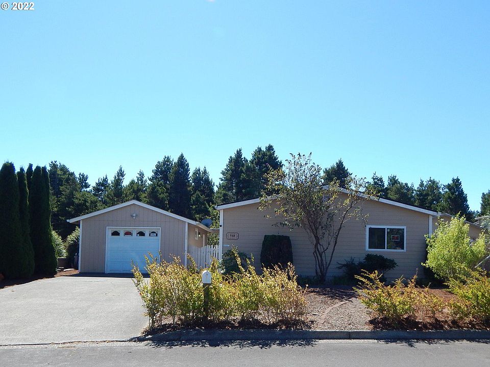 Great starter home! One level home 2 bed/2 full baths. Living/great room w/vaulted ceiling. Den/office/hobby area too! Nice sized Primary Suite w/Walk-in shower & Walk-in closet. Newer stainless kitchen appliances. Sliding door from dining room leads to covered private deck. Fenced back yard, fruit trees & shed. Close to Golf Course, 10 mins to Old Town Florence and Beaches!