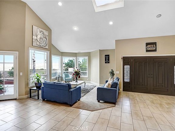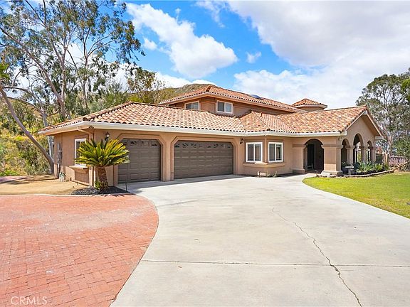 Beautiful Gorgeous Welcoming home in Reche Canyon. Welcome to your gated estate with open floor plan, gorgeous kitchen, entertaining spaces indoors and out, barn with fenced area, pool, views of mountains/city lights and boat/RV parking. Close to everything, yet your own private retreat. A paved/concrete driveway leads to the front entrance that welcomes you with double doors opening to an incredible entry with soaring ceilings. The entry flows directly into the living room and kitchen/island with the dining room and family room just beyond. Kitchen has been upgraded with newer cabinets, granite countertops, lighting and 2 pantries (one includes a laundry area). The expansive granite island is designed with a curve that easily accommodates 6 people who can all see each other while dining. The family room (with woodburning fireplace), living room and formal dining area are flexible spaces with easy access to the backyard and conducive to entertaining large groups. On the main level are two bedrooms, one of which connects to the downstairs bathroom. Upstairs you will find the primary bedroom with ensuite bath, a secondary bedroom and full bath. The garage connects to the house through a hallway that has cabinets for storage. The primary suite is well appointed with a walk-in closet, a sitting area/retreat, fireplace and views of the city lights. Leased solar helps keep electric costs reasonable. This property includes the main 2 acre parcel and an adjoining parcel of 0.88 acres.