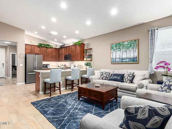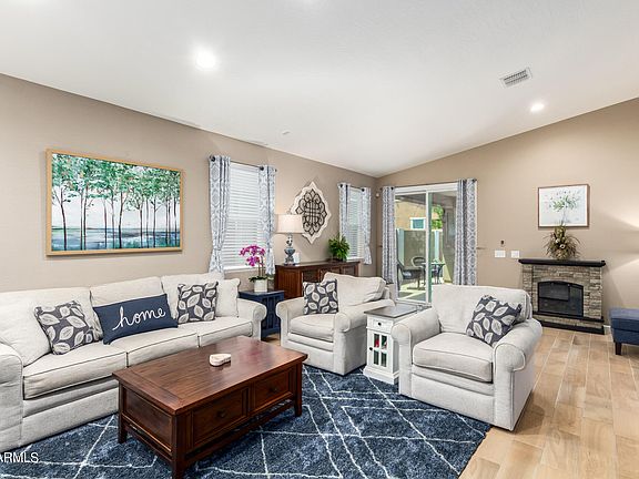 Looking for a new home? This fantastic 4 bed, 3 bath residence now on the market is the one for you! Featuring a charming facade w/brick veneer accents, a low-maintenance front yard w/artificial turf, rain gutters, a 2 car garage, and a welcoming front porch. Inside you will find a spacious open floor plan w/elegant wood-look tile flooring, Cox gigablast fiber, vaulted ceilings, pre-wired surround sound, recessed can lights, and custom palette throughout. The gorgeous kitchen offers 42'' cabinetry w/crown moulding & dimmable under/over lighting, a pantry, white quartz counters, extended tile backsplash, upgraded slate appliances, new single bowl stainless sink & faucet, daytime skylight w/solar nightlight, and a peninsula complete w/a breakfast bar. The large primary bedroom boasts soft carpet, a walk-in closet, and a private ensuite w/dual sinks. All bedrooms include ceiling fans, and one of them can also serve as a flex room! Finally, the lovely backyard showcases a covered patio w/an outdoor ceiling fan, drip system, cool decking, and a PebbleTec pool w/custom lighting & water feature, plus auto clean system! Don't wait any longer, act now!