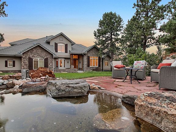 NEW PRICE ***$1,395,000*** ; Pine Trees and Privacy surround this beautiful custom home located in the Prestigious Pinnacle area of Forest Park in Castle Pines! Located in a cul-de-sac with a front yard waterfall and pond, this recently updated home includes the following: NEW interior paint throughout, NEW carpet in Master Bedroom, refinished hardwood flooring, NEW light fixtures, NEW master shower enclosure, NEW decking and updated landscaping. Floor to ceiling windows bring the outdoors in, along with views of Pikes Peak, Castle Pines Village Golf Course and Castle Rock can be enjoyed from all 3 of the decks/patios. Heated flooring in the kitchen and laundry room will keep you feeling comfortable, even in the coldest months. State of the art appliances will bring out the inner chef with a cozy Hearth Room to complement! The walkout basement includes a room for everyone, outdoor custom fire pit and hot tub. This is mountain living in the heart of Castle Pines!
