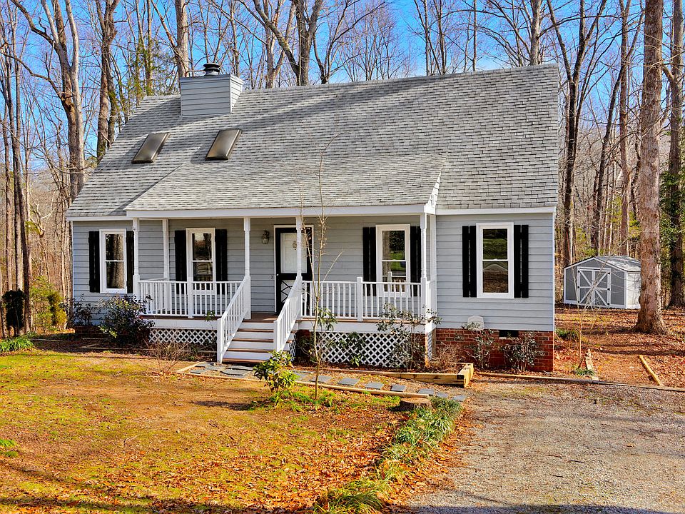 All new replacement windows! Big lot backing up to 1 acre of private woods, great cape in lovely condition, newer heat pump, full front porch double detached storage shed, newly painted exterior, newly painted interior, vaulted great room with wood burning fireplace, upstairs master with large jetted tub, lots of closets, pull down attic, all appliances, 1 year warranty!, security system, big rear deck to enjoy the privacy, good schools, fireplace and chimney convey as is with no known defects