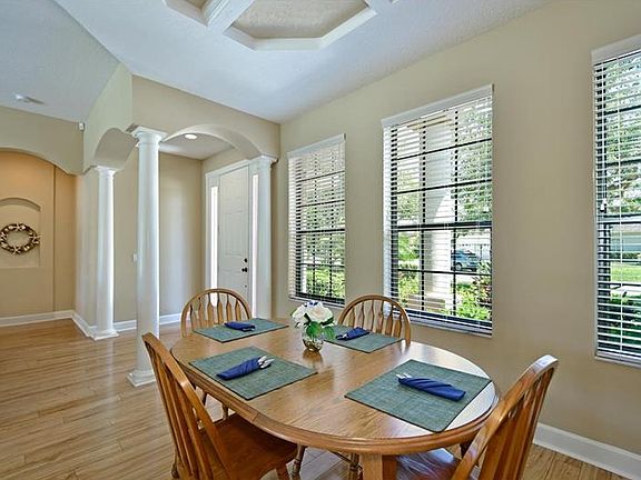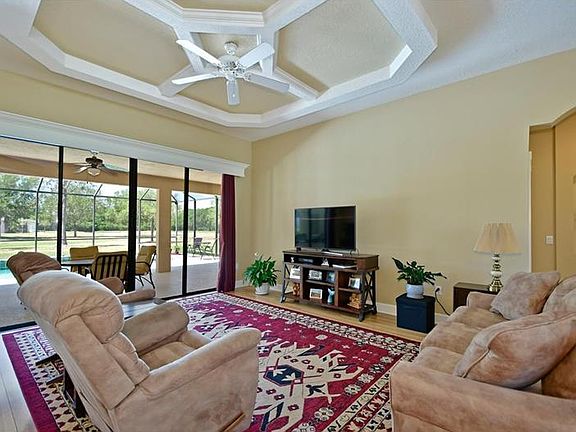 This split plan, light and bright home built by Bruce Williams is located on one of the largest and nicest lots (.31 acres) in Lakewood Ranch. Architectural upgrades include coffered ceilings in the dining and living rooms, double tray ceiling in the master bedroom, and columns in the entryway. Beautiful wood laminate throughout except for the newer 20" ceramic tile in both bathrooms. Kitchen has 2016 stainless steel appliances with a gas range, Corian counters, breakfast bar with pendulum lights, large pantry, and a breakfast nook with a built in desk. Lots of closet space with two walk in closets in the master bedroom and walk in closets in both guest rooms. Master bedroom features a double tray ceiling and a clerestory window for additional natural lighting. Additional storage can be found in the extra large closet that is almost the entire width of the hallway. Separate laundry room features lots of extra cabinets and a laundry tub. There's also extra cabinets in the garage for storage. Home newly painted in 2015, A/C and water heater replaced 2013. Large lanai with gas heated pool and waterfall enhance the serene backyard view of the vast greenbelt view which overlooks the lake. Peace of mind with the option to utilize the child safety fence for the pool. Lakewood Ranch is one of the premiere master planned communities with amenities from golfing, tennis, walking and biking trails, dog parks, shops, movie theater, miniature golf, restaurants, and shops to suit all interests.