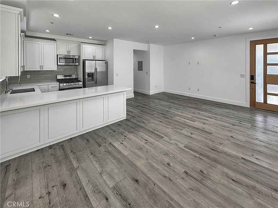 Experience modern living at 7125 South La Cienega Boulevard, a gated 2020-built building offering 1,300 sq ft of thoughtfully designed space. This stylish 3-bedroom, 2 bathroom apartment features an open-concept main level with recessed lighting, laminate floors, and a modern kitchen boasting stainless steel appliances, quartz countertops, and a center island with bar seating perfect for everyday living or entertaining. The spacious primary suite includes a deep closet with built-in organizers and a sleek en-suite bathroom. Additional amenities include central air conditioning, in-unit washer dryer, a private 1-car garage, plus one exterior parking space, and secure gated access. Ideally located near Fox Hills, Culver City, West Adams, and Westchester with SoFi Stadium, LAX, and Playa Vista just minutes away.