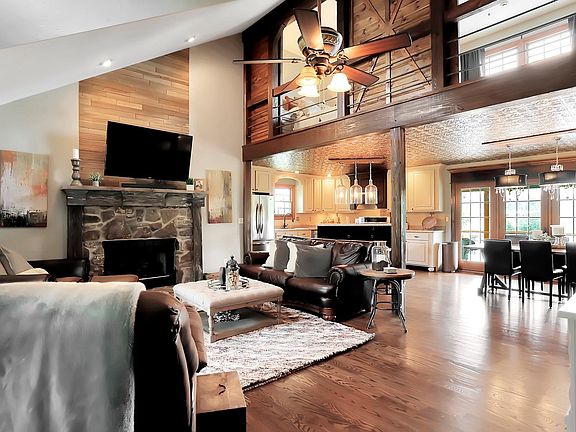 Gentleman's Ozark Hobby Farm with Contemporary two story Rock and Cedar Home featuring 2 stone fireplaces, 3 bedrooms and 3 baths in an Open Concept with full finished walkout basement. This home has been totally updated in Modern Farm Style with oak wood flooring, Sliding Barn Doors, and a gorgeous stamped tin ceiling in the Kitchen. The Kitchen itself has custom cream cabinets with island bar and stainless steel appliances that includes a Frigidaire gas range with two ovens and warming drawer. The Great Room is Absolutely Beautiful with Dormer Window for added Natural Light, Vaulted ceilings and a Stone Gas Fireplace with Reclaimed wood mantle. Upstairs is one of the coolest master suites with pine floor, barn doors, recently updated master bath with travertine tile, Shower System shower, 2 vanities and his and her closets. Walkout basement is entertainer's dream with Floor-to-Ceiling natural Stone Wood Fireplace, family room and new wet bar with butcher-block countertop. Two beautiful outdoor living areas, one off the dining room is a covered composite Deck with stylish wood and rebar railings and stair access to below. This entertaining area gives you a view of the stocked lake and mature trees and pasture. Second outdoor space is just out the walkout basement and is a partially covered patio with new stamped concrete and stacked stone pillars. Farm has lush pasture with good cattle tight fencing, 2 outbuildings, 24x30 and 30x50, one with concrete floor and frost free hydrant and both with electric. Home has highway frontage and manicured landscaping. Located just a few minutes from town and in West Plains School District!