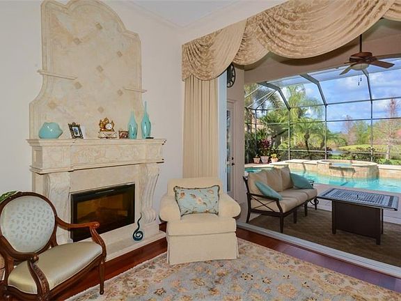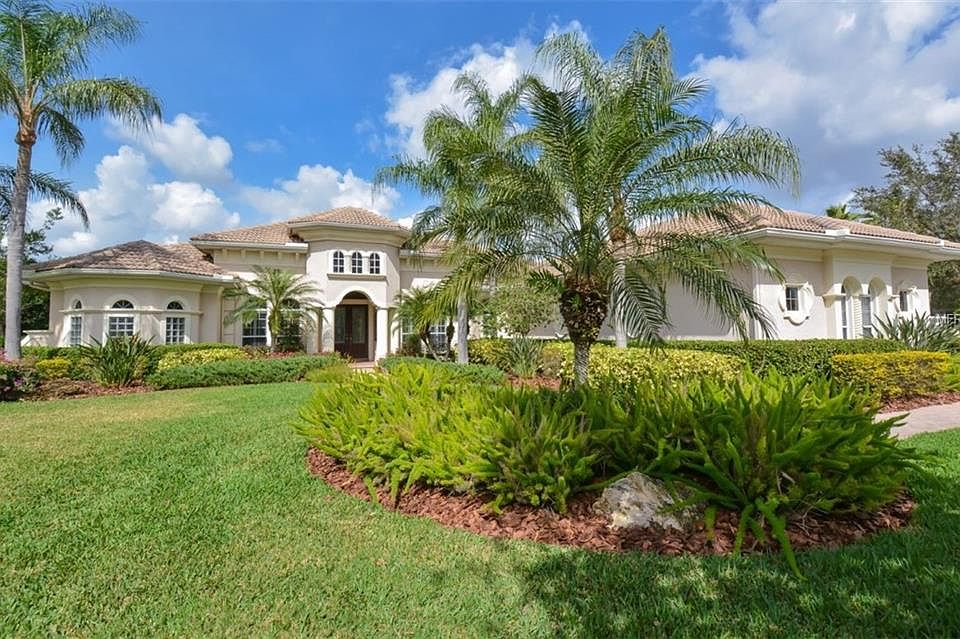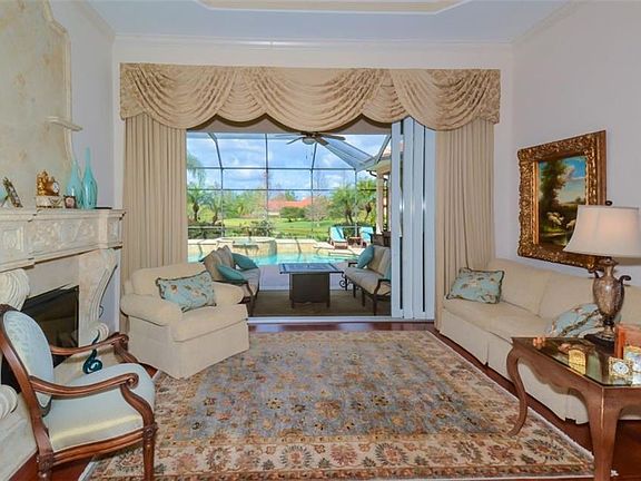 This fabulous John Cannon built custom home, is situated on a .5 acre lot with lake view, in the heart of Lakewood Ranch Country Club. Beautiful etched glass double entry doors invite you into the elegant foyer. The living room has a double tray ceiling with crown molding, rich wood flooring, cast coral stone fireplace with electric remote controlled fire & quality sliding doors onto the lanai. The family room has a featured decorative high ceiling, pocketing sliding doors and entertainment center built-in with TV, surround sound with speakers. The kitchen is spacious with wood cabinetry, granite countertops, tiled backsplash, gas cooktop, lit glass display cabinets & a useful desk area. Breakfast nook with aquarium window from which to enjoy the view. The office has wood flooring, a built-in desk & bookshelves. Master retreat offers a spacious bedroom with sitting area, walk-in closets, en-suite bathroom with dual vanities, walkthrough shower & soaking tub. Three further bedrooms. Quality custom drapes throughout. Heated pool & spa with plenty of room for entertaining. Outdoor kitchen with stainless steel grill, sink, storage & refrigerator. FOUR car garage! This home is move-in ready! Close to Lakewood Main St with shops, restaurants and cinema, easy access to I-75 & UTC Mall.