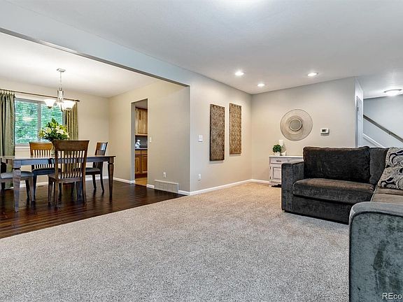 Immaculate & charming 2 story-style home in Arvada's highly desired Ralston Valley neighborhood w/ wonderful huge trees and mature landscaping! Classic covered front porch-a place to enjoy cool summer evenings-add a swing & watch kids play out front. Step inside this traditional layout in excellent condition. Open formal living with newer carpet which flows into formal dining room. Large picture windows to enjoy a very private lot on a quiet block. Kitchen boasts beautiful hickory cabinets, laminate countertops, stainless steel appliances, & hardwood floors. Kitchen & nook connect to adjacent family room w/ built in gas log fireplace for cozy winter evenings & beautiful appeal with brick surround & eye catching colors. Completely repainted main level interior in current colors, very fresh & nice! Convenient main floor half bath, access to attached garage, single door to rear yard, updated windows and nice size closets. Upstairs you'll find 4 bedrooms total. 3 nice sized spare bedrooms sharing full hall bath and a spacious master bedroom w/ ceiling fan, well-done remodeled en-suite master bath & 2 closets (one walk-in, one bifold doors). Basement offers flex space, great for movie nights or you can use it as a kids playroom. Bedroom and 3/4 bath are functional for a guest or teen suite. Laundry room fits side by side washer & dryer w/ a folding counter and extra pantry space for storage. Updated utility systems, access to crawl space and ample storage. The covered patio at the back patio is wonderful. Private flat backyard, with 6' privacy fence, storage shed, flagstone pavers surround wood burning firepit great for summer marshmallow roasting & family time. Massive shade trees give this property a nostalgic feel & real beauty. A rare property in this price point feeding into Ralston Valley High School with 10 of 10 scores for college prep. Fabulous elementary and middle schools too...steps to the Ralston Creek trail which spans miles for your outdoor enjoyment!