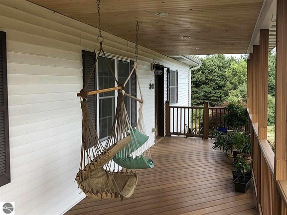 Spacious 2BR, 2BA ranch w/open floor plan, cathedral ceilings, central air, full walkout basement, ceramic tile, hickory kitchen cabinets w/built in desk, master suite with walk in closet, jetted tub/shower stall. New carpet being installed. Full partially finished walkout basement w/sauna, composite decking & covered front porch. Newer Dishwasher and Microwave. Includes a 28' x 28', 2 car insulated and heated attached garage and 30' x 60' stick built, drive thru outbuilding with 3 overhead doors (Largest is 14' x 14') for all the toys. Property borders conservancy property to the North. Listed in Traverse City school district but Elk Rapids school bus stops right out front for school of choice.