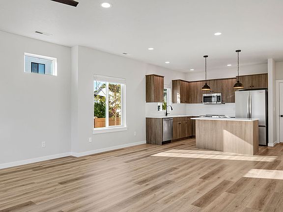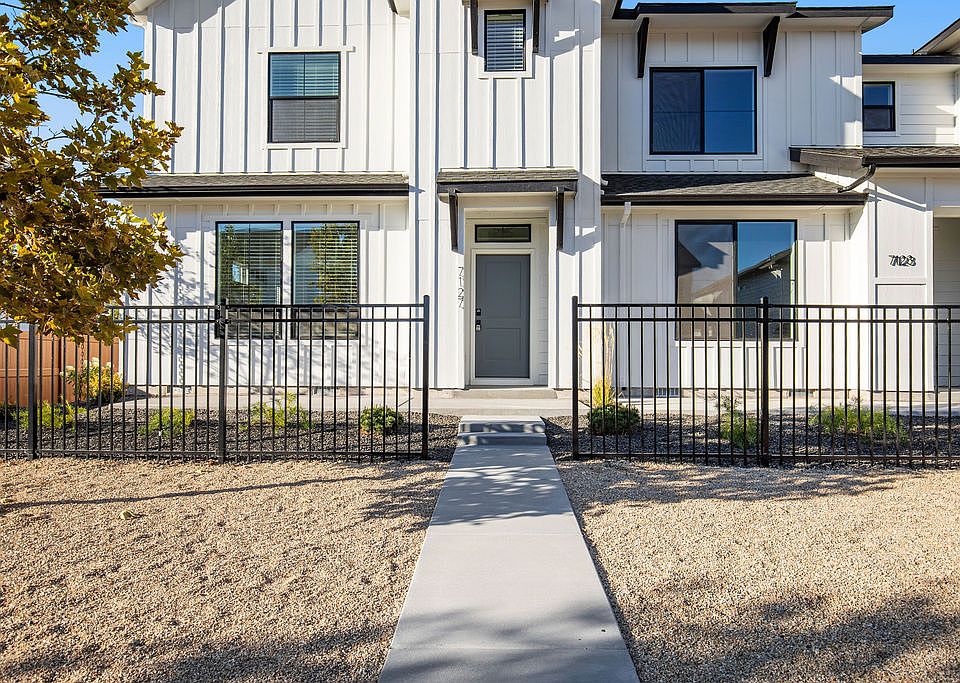 Be the first to live in this never occupied townhome in a vibrant Boise community. Step into an inviting great room with 9 ft ceilings and open concept living that flows to a stylish kitchen featuring solid surface countertops, soft close cabinets with hardware pulls, full tile backsplash, and stainless steel appliances with an electric range. The private primary suite includes an attached bath and a spacious walk in closet. Enjoy truly low maintenance living the HOA maintains landscaping, exterior paint, and roof and the home comes with full fencing and landscaping included.