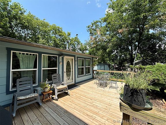 Very well maintained 2 bed ,2 bath home sits on almost half an acre lot with beautiful views of pasture & wildlife. Located a block from Ft. Gibson Lake. The home features a Florida room with lots of natural lighting, Living Room with wood burning stove. Kitchen has lots of cabinet and counterspace. Separate dining area that opens up to kitchen and living room. Full Bath and utility room located downstairs. If you are looking for spacious bedrooms this home has it. Balcony located off the master & large his/her walk-in closets. The garage man cave is AMAZING with space to fit 4 cars deep or fit your boat or toys with work area. Fenced yard for the animals, storage building, Firepit and extra parking.