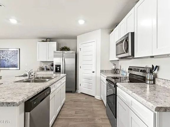 Beautiful Cali floorplan in Olde Towne Village! Conveniently located near shopping, dining and Tyndall Air Force Base. The Cali features four bedrooms with one that can be used as a den or office. As you enter this home you will find quality paint with an orange peel textured walls and traditional 8' ceilings. Vinyl flooring throughout all common areas of the home and each bedroom has plush carpets with a pad. The kitchen is open and spacious with a center island and includes a pantry, beautiful light cabinetry, and durable laminate countertops. The appliances include a dishwasher, stove, and microwave. The main first bedroom has a nice sized bath with a separate shower and a large soak tub, as well as a large walk-in closet.