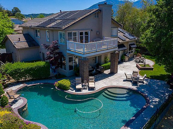 Exquisite, Former Model in Falcon Ridge at Oakhurst Country Club backing to open space on a premium view lot w/ custom in-ground pebble tech free form pool w/ raised spa & solar heat, extensive custom stamped patio with raised view patio area, built-in bbq island, cozy firepit, lush lawn area & professional landscape! Formal LR & DR feat gorgeous "French Oak" hw flrs on 1st flr. Downstairs den & full bath. Chefs delight kitchen boasts granite tile counters & center island, prof grade stainless appliances, casual dining nook & pantry. Expanded FR offers a elaborate brick fireplace w/ raised hearth &custom built-in cabinetry. Enormous mst suite w/ cozy gas fireplace & French Doors to deck w/ awe-inspiring views. Lavish mst bath feat tub with separate stall shower, dual vanity & huge walk-in closet. Custom baseboards, crown moulding, plantation shutters home & pool solar & more! Sprawling backyard oasis offers the best views in Clayton - hills, valley, city lights, Carquinez, Mt Diablo.
