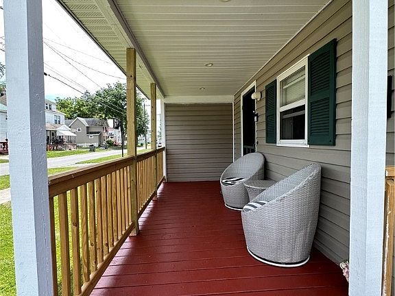 Around the corner, same floor has a good size living room, large master bedroom, attached full bath with a stand-up shower and a walk in closet. 2nd floor has 2 additional bedrooms, both quite large and another full bath with tub. Walk outside to a freshly painted partially covered deck, with totally private fenced in yard that leads to detached garage with attached shed and also a loft area. New railings and paint on front porch also.