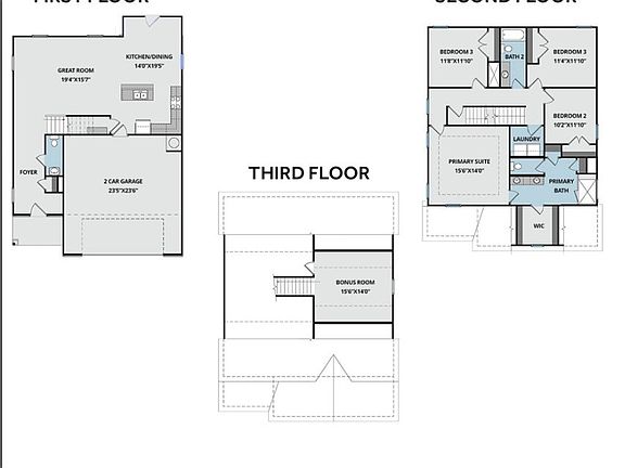 The Bailey. Great room with gas log fireplace. Kitchen features island, quartz countertops, subway tile backsplash set in a brick pattern, pantry, and dining area; SS microwave, D/W and gas range. Rear covered porch is easily accessible through the dining area. Half bath with pedestal sink. All bedrooms on second floor with access to full bathroom with vanity, tub/shower combination and lvp flooring. Second-floor laundry room with washer/dryer connections and lvp flooring. Primary suite with tray ceiling and crown molding; Primary bathroom with access to walk-in closet, dual sinks with quartz countertop, shaker cabinets with center drawer stack, linen closet, walk-in tile shower, private water closet, and tile flooring. Finished bonus room on third floor! Durable luxury vinyl plank floors throughout the first floor. Front door with transom window and sidelights providing natural light in the foyer.