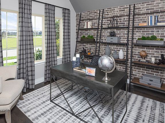 READY FOR MOVE-IN! Former Model Home. Home office with French doors set at entry with 12-foot ceiling. Hardwood floors throughout living areas. Extended entry leads to open kitchen, dining area and family room. Kitchen features corner walk-in pantry, generous counter space and island with built-in seating space. Dining area flows into family room with a wood mantel fireplace and wall of windows. Primary suite includes double-door entry to primary bath with dual vanities, garden tub, separate glass-enclosed shower and two large walk-in closets. A guest suite with private bath adds to this spacious one-story home. Model home upgrades include accent paint, drapes, alarm system, sprinkler system, and additional landscaping. Covered backyard patio. Mud room off two-car garage.