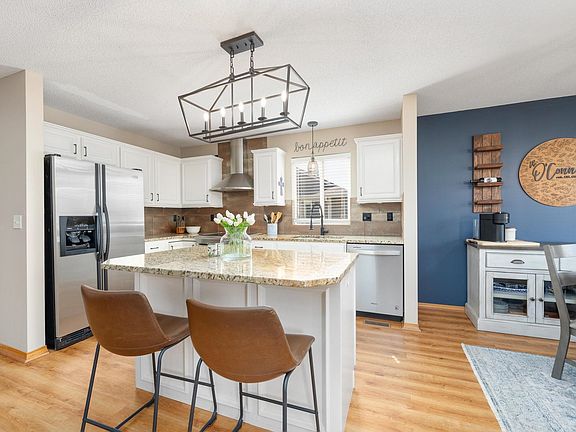 This beautiful and well maintained 4 Bed 3 Bath, 3 car garage home in Preston Trails will knock your socks off!  As you walk in the front door you immediately notice the updated luxury vinyl flooring throughout the main floor. The spacious entryway leads into the main floor living space featuring a cozy fireplace and two large windows allowing plenty of natural lighting.  In this open concept floor plan the kitchen offers a granite island perfect for entertaining as well as a separate dining space. Through either the dining room or primary bedroom you are able to access the beautiful updated composite and covered back deck. The primary bedroom also features its own bathroom with two sinks, granite countertops, a bathtub and separate shower.  Updated light fixtures add a modern touch throughout. The basement rec room with a wet bar is ideal for gatherings. Natural light brightens the space through view-out windows.